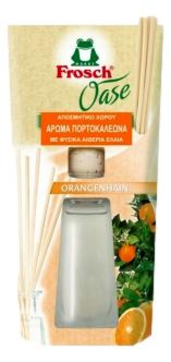 Αποσμητικό χώρου με φυσικά αιθέρια έλαια για χαλάρωση, έμπνευση και ξεκούραση. Οι ευωδιές και τα αρώματα έχουν χρησιμοποιηθεί στον τομέα της αρωματοθεραπείας για αιώνες. Το αποσμητικό χώρου Frosch OASE με την ποικιλία αρωμάτων που διαθέτει, είναι βασισμένο σε αυτήν την αρχαία γνώση. Τα αιθέρια έλαια δημιουργούν μια ατμόσφαιρα αναζωογόνησης και διέγερσης στο σπίτι σας. Χρήση: Απλά αφαιρέστε το φελλό από το μπουκάλι και τοποθετήστε μέσα σε αυτό, ομοιόμορφα, τα ξυλάκια ινδικού καλάμου που περιλαμβάνονται στην συσκευασία. Μόλις τα ξυλάκια απορροφήσουν το υγρό, μια λεπτή αίσθηση ευωδιά και φρεσκάδας γεμίζει το δωμάτιο. Μπορείτε να ελέγξετε την ένταση του αρώματος: όσο περισσότερα ξυλάκια τοποθετήσετε μέσα στο μπουκάλι, τόσο πιο έντονο θα είναι το άρωμα. Διάρκεια: 6 - 8 εβδομάδες.