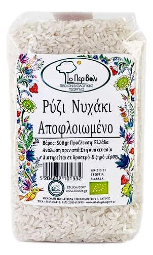 Βιολογικό ρύζι νυχάκι αποφλοιωμένο από το “Περιβόλι της Οικολογίας”. Η «ΟΙΚΟΛΟΓΙΚΗ ΑΓΟΡΑ» και το «ΠΕΡΙΒΟΛΙ ΤΗΣ ΟΙΚΟΛΟΓΙΑΣ» δημιουργήθηκαν το 1992 από ανθρώπους που δραστηριοποιούνται στον χώρο της προστασίας του περιβάλλοντος και της προώθησης της βιολογικής γεωργίας, με πρωταρχικό στόχο να δώσουν εμπορική διέξοδο στα πρώτα προϊόντα που άρχισαν να παράγονται στην χώρα μας με τη μέθοδο της βιολογικής γεωργίας.